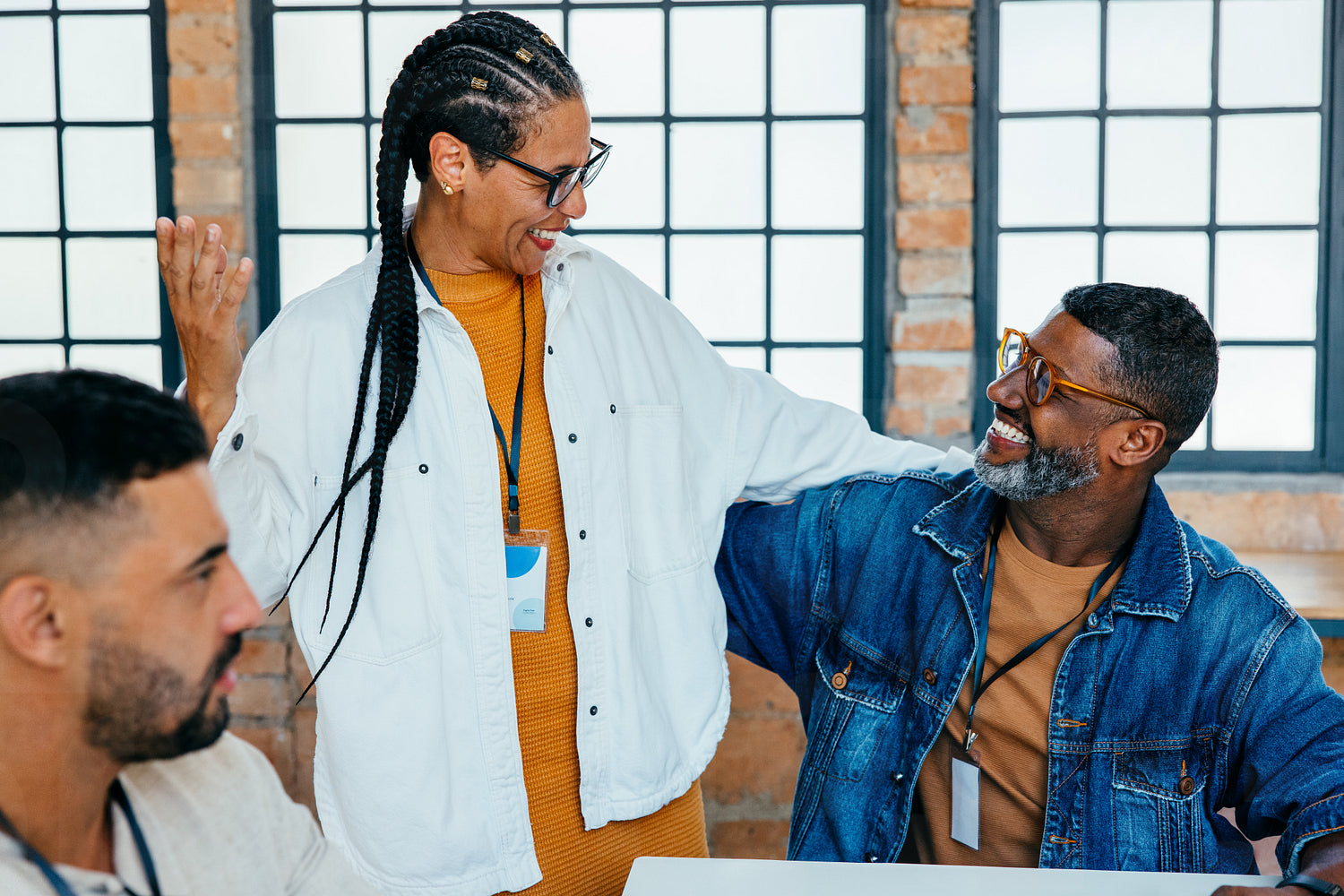 Two colleagues enjoy a moment of success, highlighting the importance of friendships and teamwork in a lively work setting.