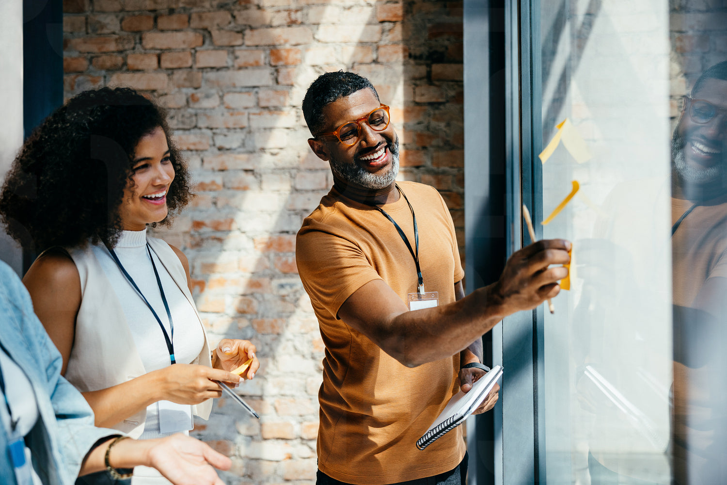 Corporate team brainstorming during a creative business meeting, using sticky notes on a glass wall in a modern office. Colleagues collaborating with smiles and enthusiasm.