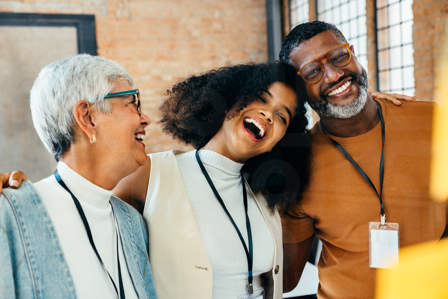 Colleagues share a joyful and friendly moment, laughing together in a startup office environment.
