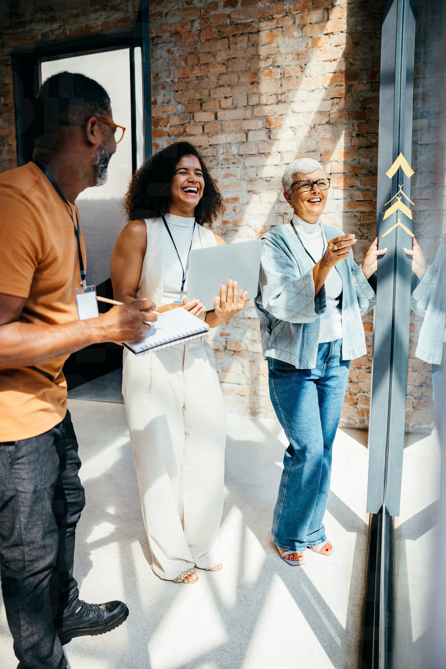 Diverse group of professionals collaborate and laugh in a modern office setting