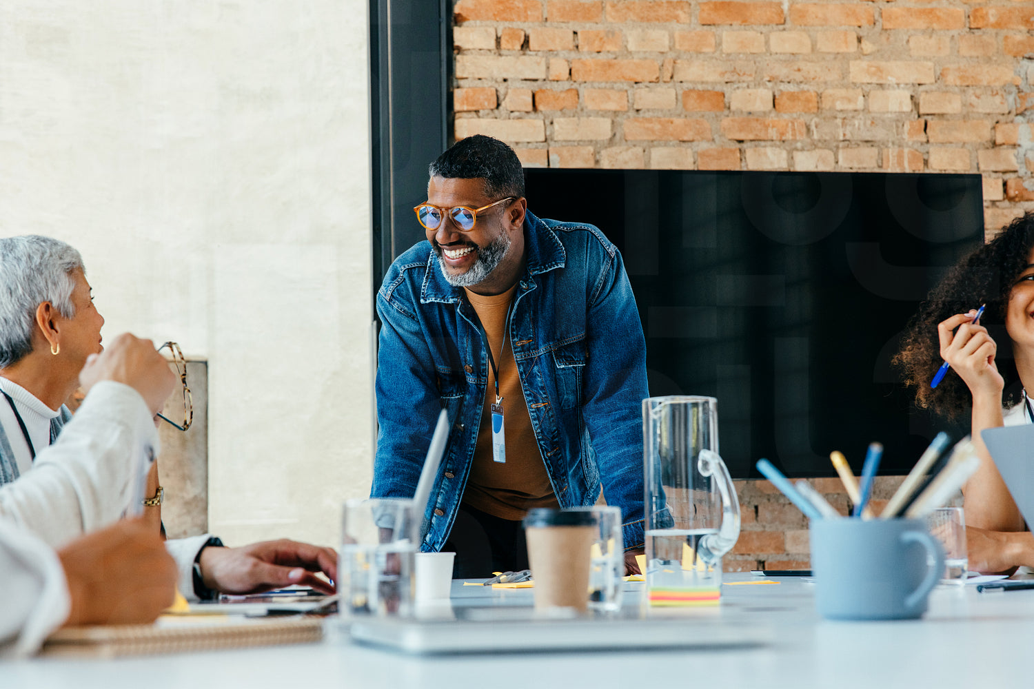 Diverse team in a modern boardroom having a productive office meeting with smiles and collaboration