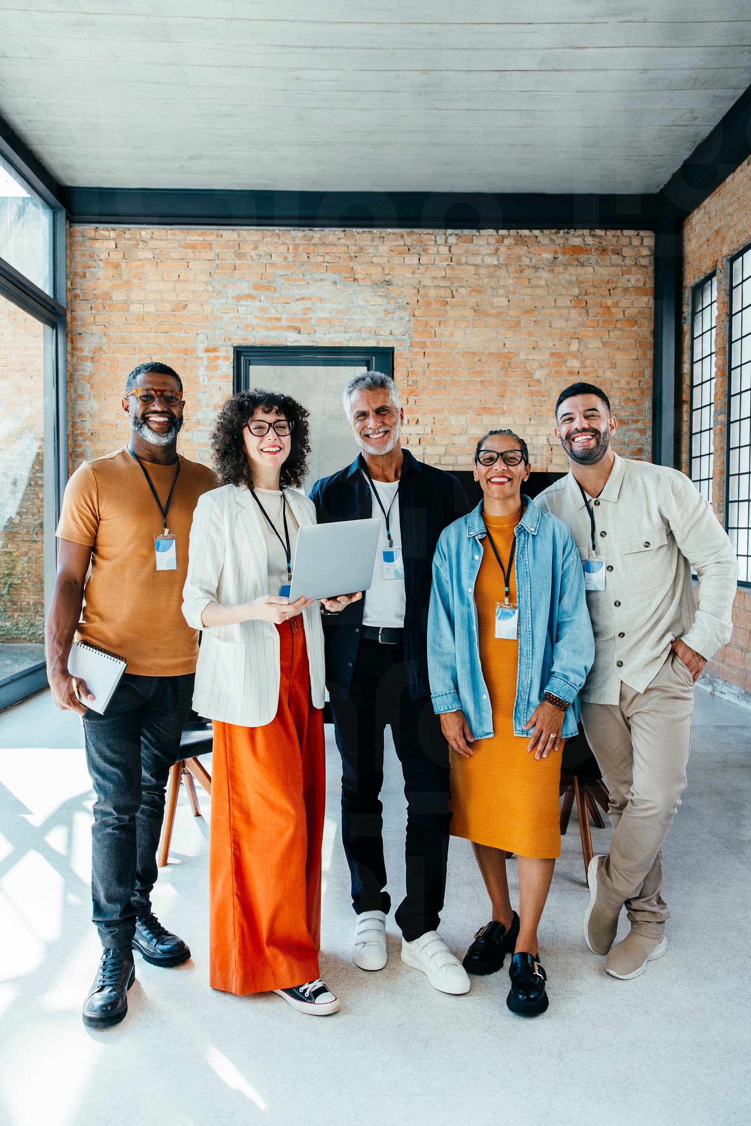 Diverse team of colleagues happily pose with a laptop in a modern office space featuring brick walls and large windows, embodying teamwork and collaboration.