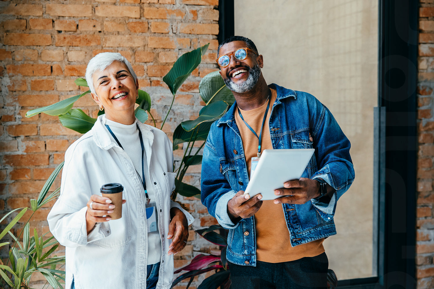 A modern corporate scene depicting two colleagues sharing a laugh during a break. A woman holds a coffee cup while a man holds a tablet, set against a stylish office backdrop.