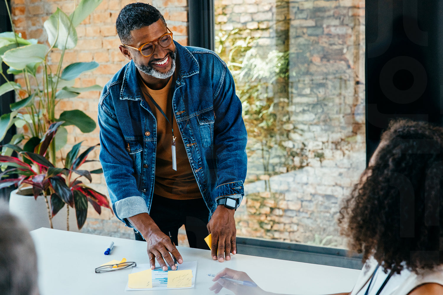 A smiling business owner in a stylish denim jacket conducts a meeting in a bright, airy office space. The setting features natural light and greenery, creating a positive and engaging atmosphere.