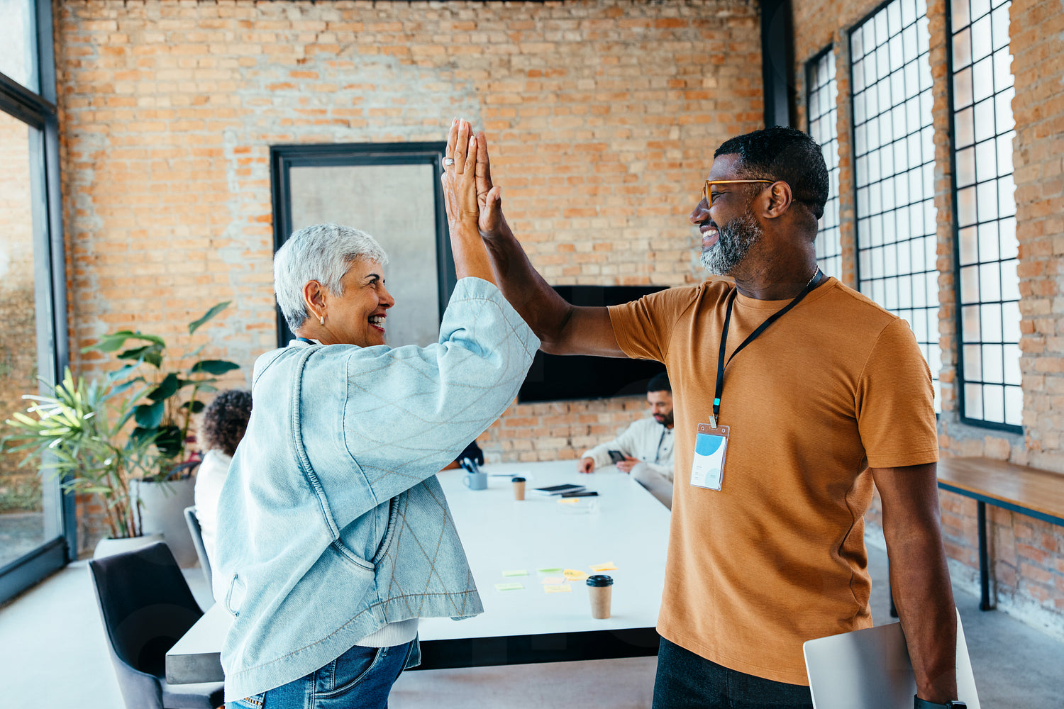 Two colleagues exchange a high five in a contemporary office setting, emphasizing successful teamwork and a collaborative spirit.