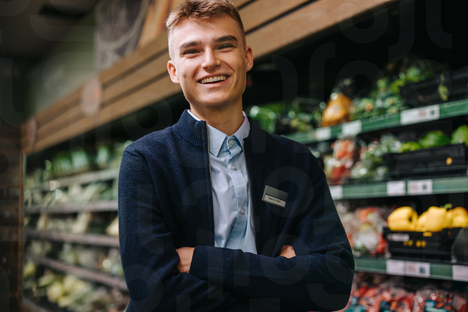 Grocery store assistant standing with his arms crossed. Happy young man working at supermarket.