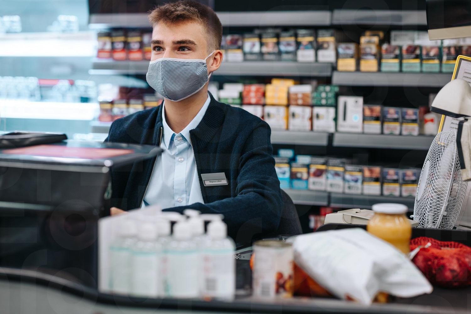 Male trainee cashier at a grocery store wearing a face mask. Young essential worker working in supermarket during pandemic.