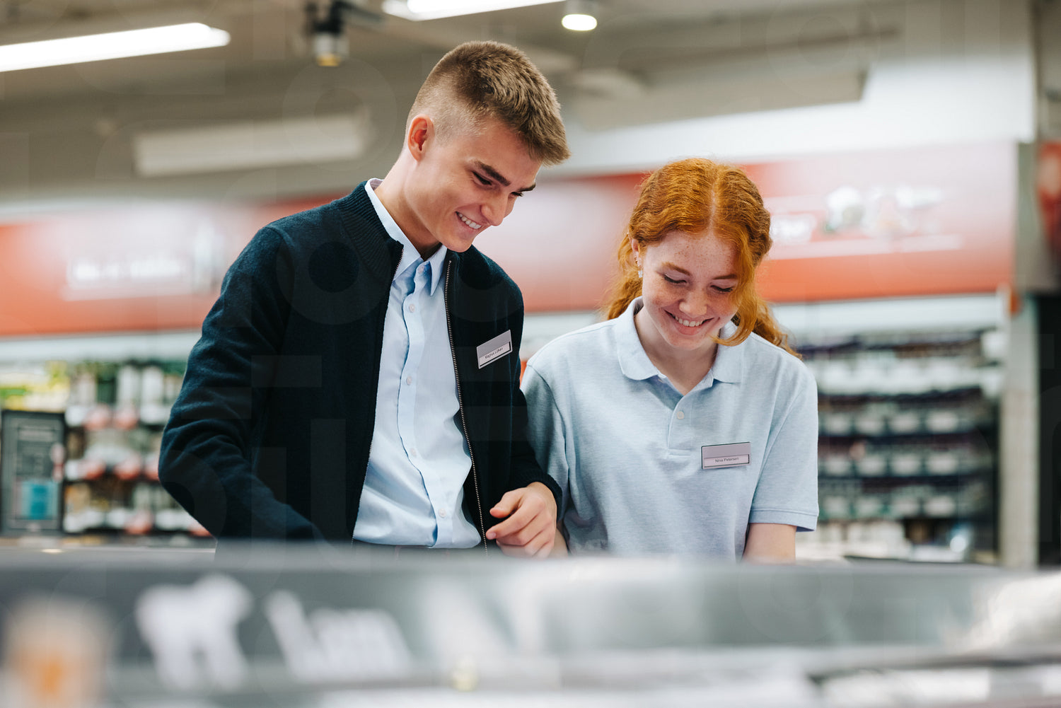Young man and woman on holiday job at supermarket. Trainees working together in grocery store.