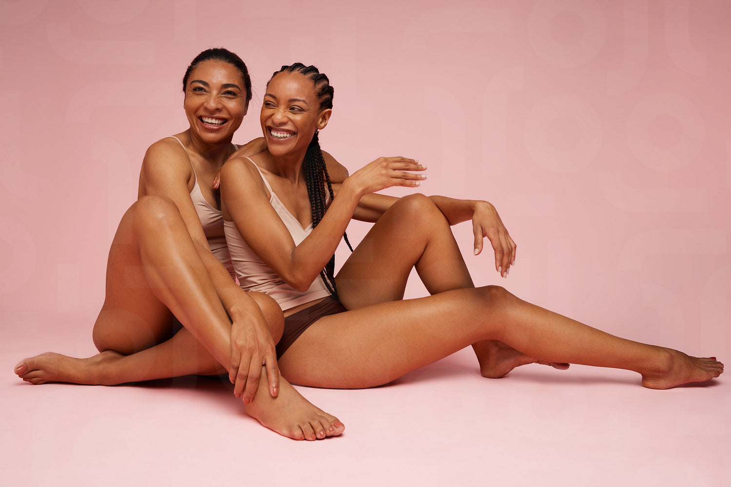 Beautiful females sitting on floor and smiling. Two mixed race women in underwear sitting over pink background.