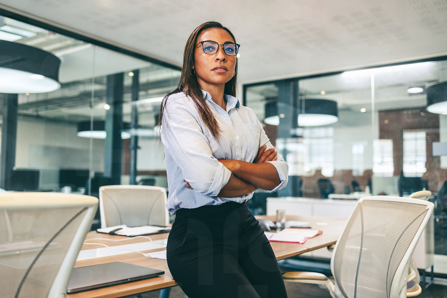 Confident businesswoman looking thoughtful in a modern office. Mid-adult businesswoman leaning on a table with her arms crossed. Female entrepreneur wearing business casual in a boardroom.