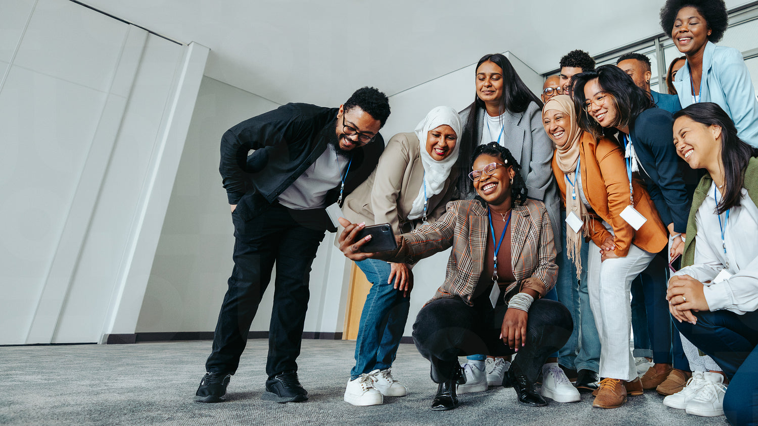 Diverse group of colleagues taking a selfie during a team bonding session at the office