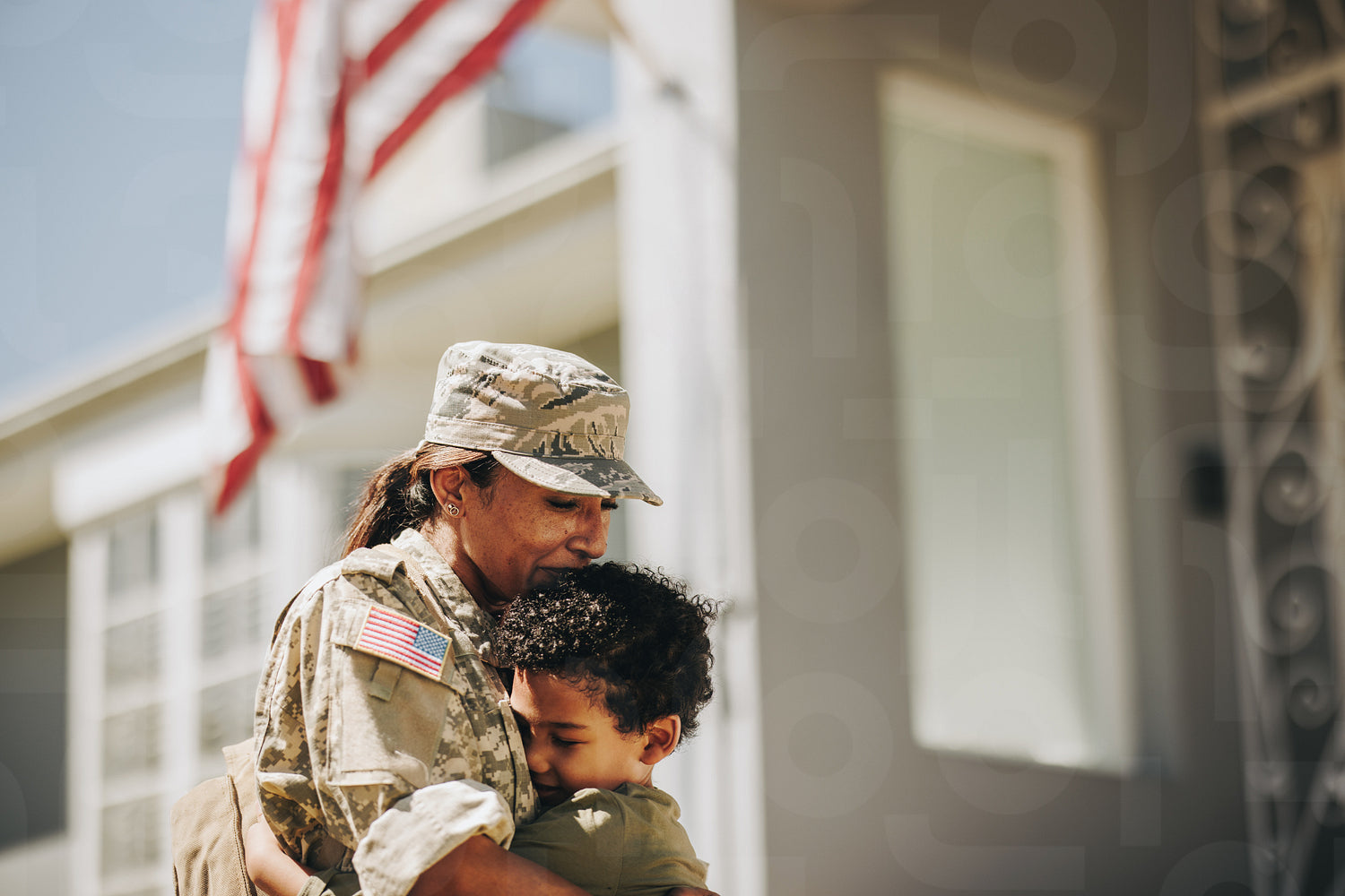 Mother and son reuniting after military deployment. Emotional mom embracing her son after returning home from the army. Patriotic female soldier receiving a warm welcome from her young child.