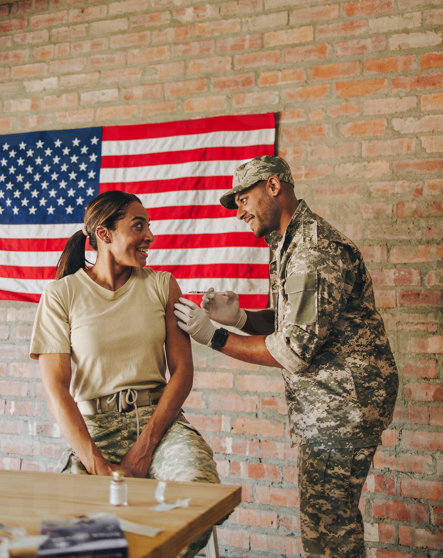 Smiling military doctor inoculating a female soldier during the coronavirus pandemic. American military physician injecting a servicewoman with a vaccine in the army hospital.