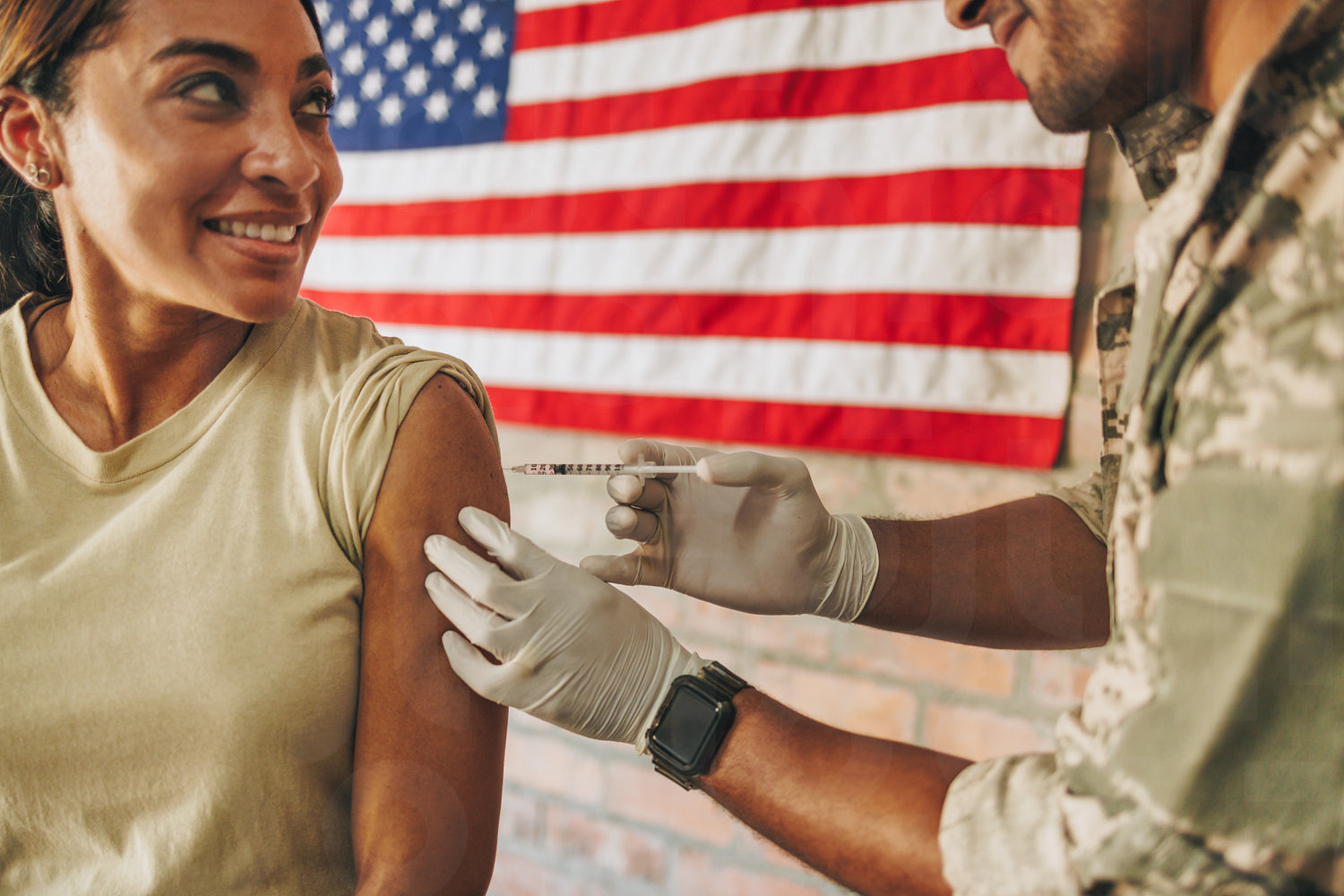 Smiling servicewoman getting vaccinated during the coronavirus pandemic. United States soldier receiving a covid-19 vaccine shot from a military physician in the army hospital.