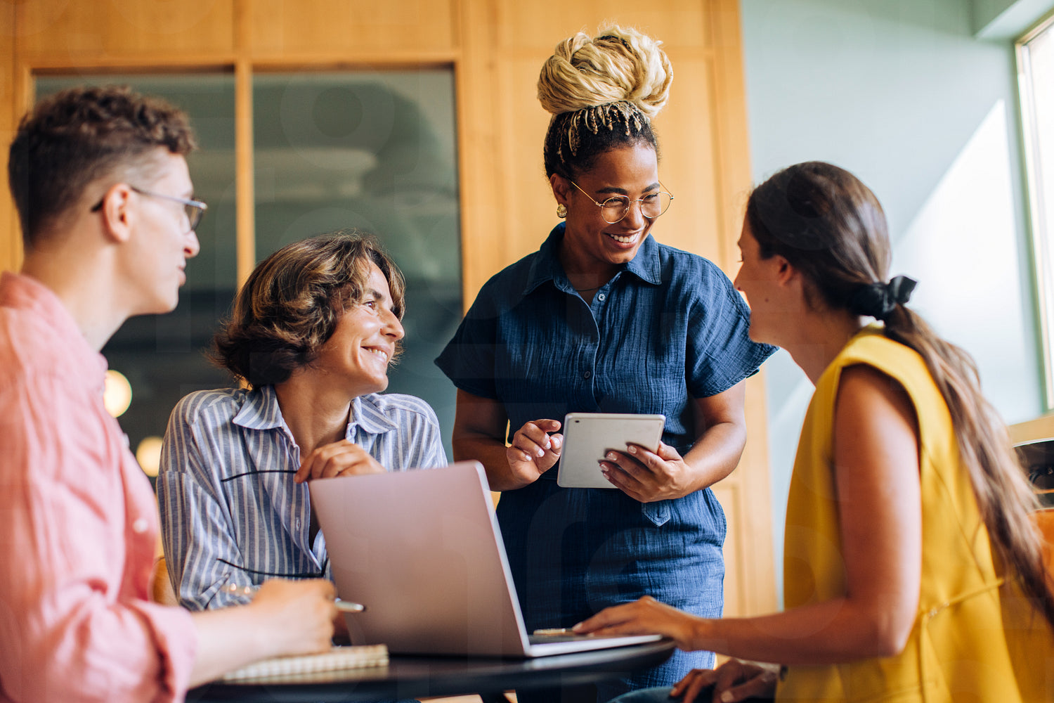A group of diverse professionals exchange ideas while utilizing digital devices during a meeting.