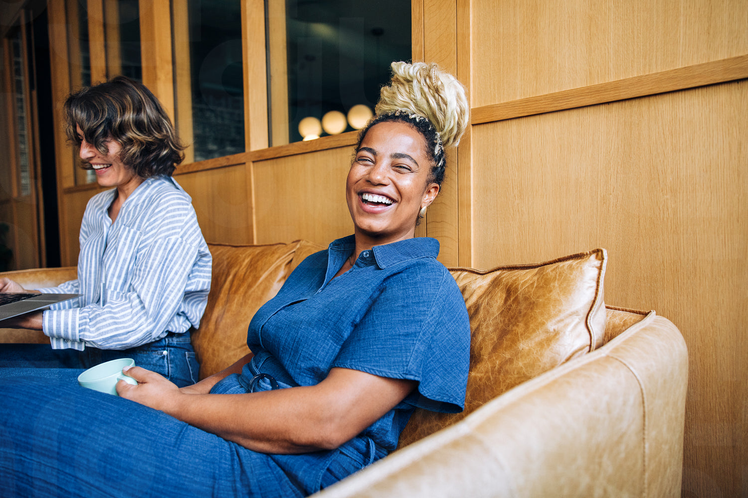 A cheerful woman at a workplace smiling towards the camera, sitting on a couch, with another woman beside her engaged in using a laptop, radiating positivity and a relaxed atmosphere.
