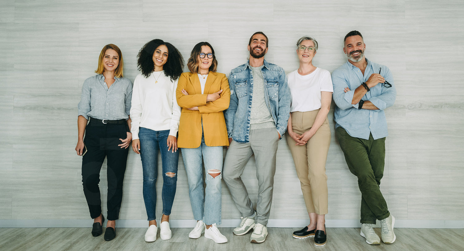 Diverse businesspeople standing together against a wall