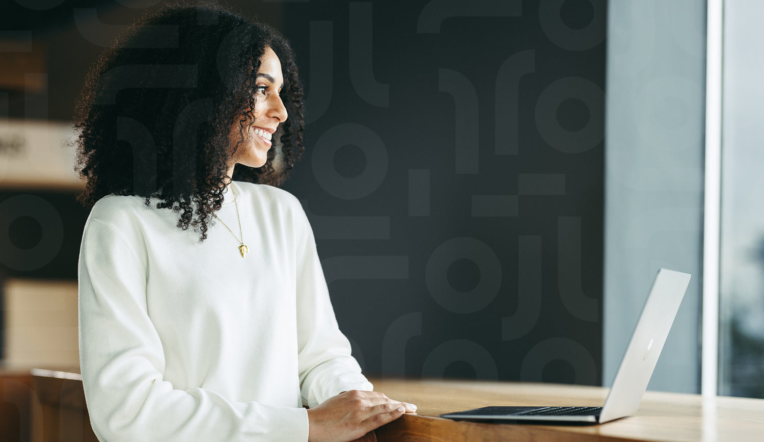Happy young businesswoman smiling and looking away while working with a laptop. Cheerful ethnic businesswoman working remotely in a modern co-working space.