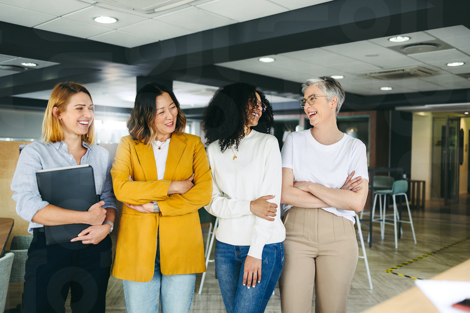 Multicultural businesswomen laughing happily while standing in a co-working office. Group of cheerful businesswomen working together as a team.