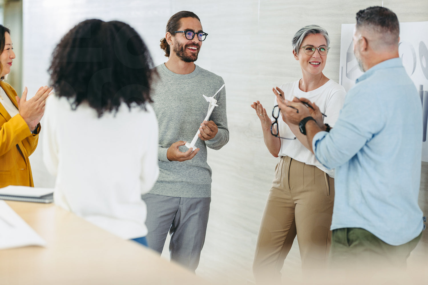 Successful designers applauding cheerfully during a meeting in a creative office. Team of innovative businesspeople celebrating their achievement in a wind turbine project.