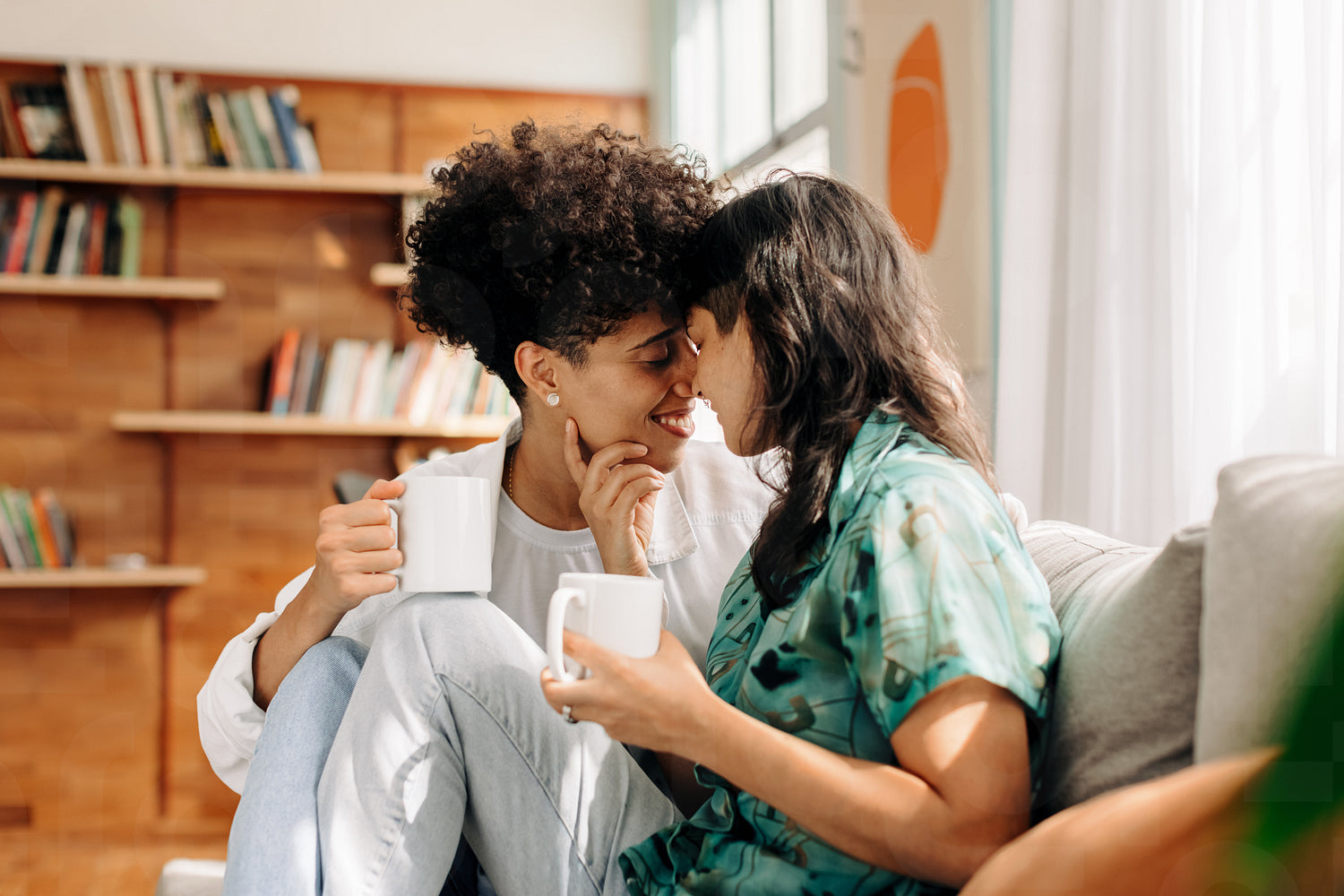 Morning romance. Two happy female lovers touching their noses together while sitting on a couch at home. Smiling lesbian couple being romantic while having coffee in the morning.