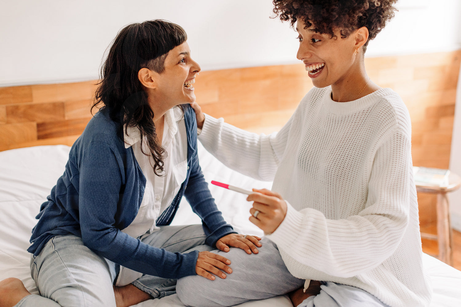Queer couple rejoicing after taking a home pregnancy test. Happy young lesbian couple celebrating their positive pregnancy test in their bedroom. Young female couple expecting a baby.