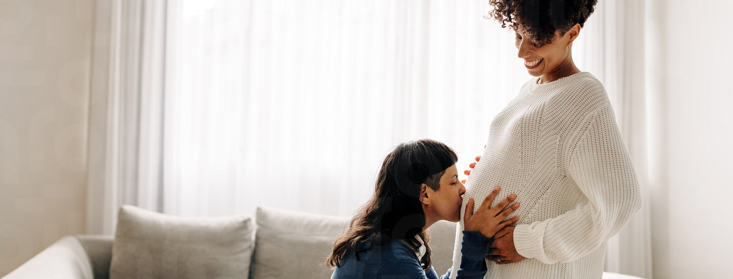 Loving young woman kissing her wife's pregnant belly at home. Young lesbian woman showing love and affection to her unborn baby. Happy young lesbian couple expecting a baby.