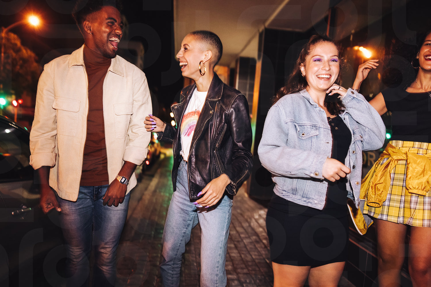 Group of multicultural friends going out together in the city. Happy friends laughing cheerfully while walking together outdoors at night. Vibrant young people having a good time on the weekend.