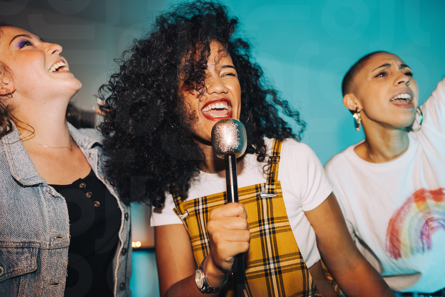 Karaoke time. Vibrant young woman singing into a microphone while partying with her friends at night. Group of happy female friends having a good time together on the weekend.