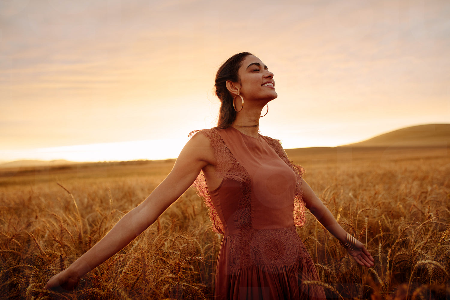 Happy woman standing with her arms outstretched in a wheat field. Female with a feeling of freedom.