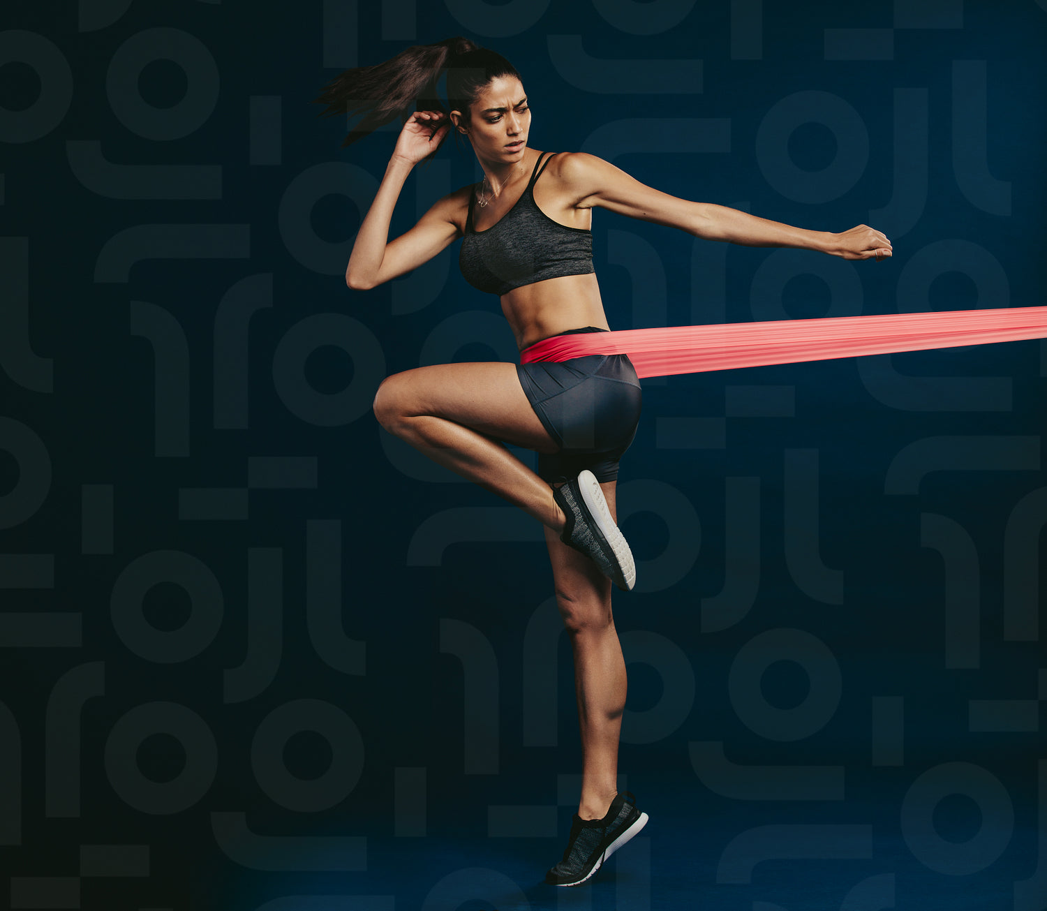 Healthy woman in sportswear working out with resistance band. Female athlete doing stretching exercises with elastic band.