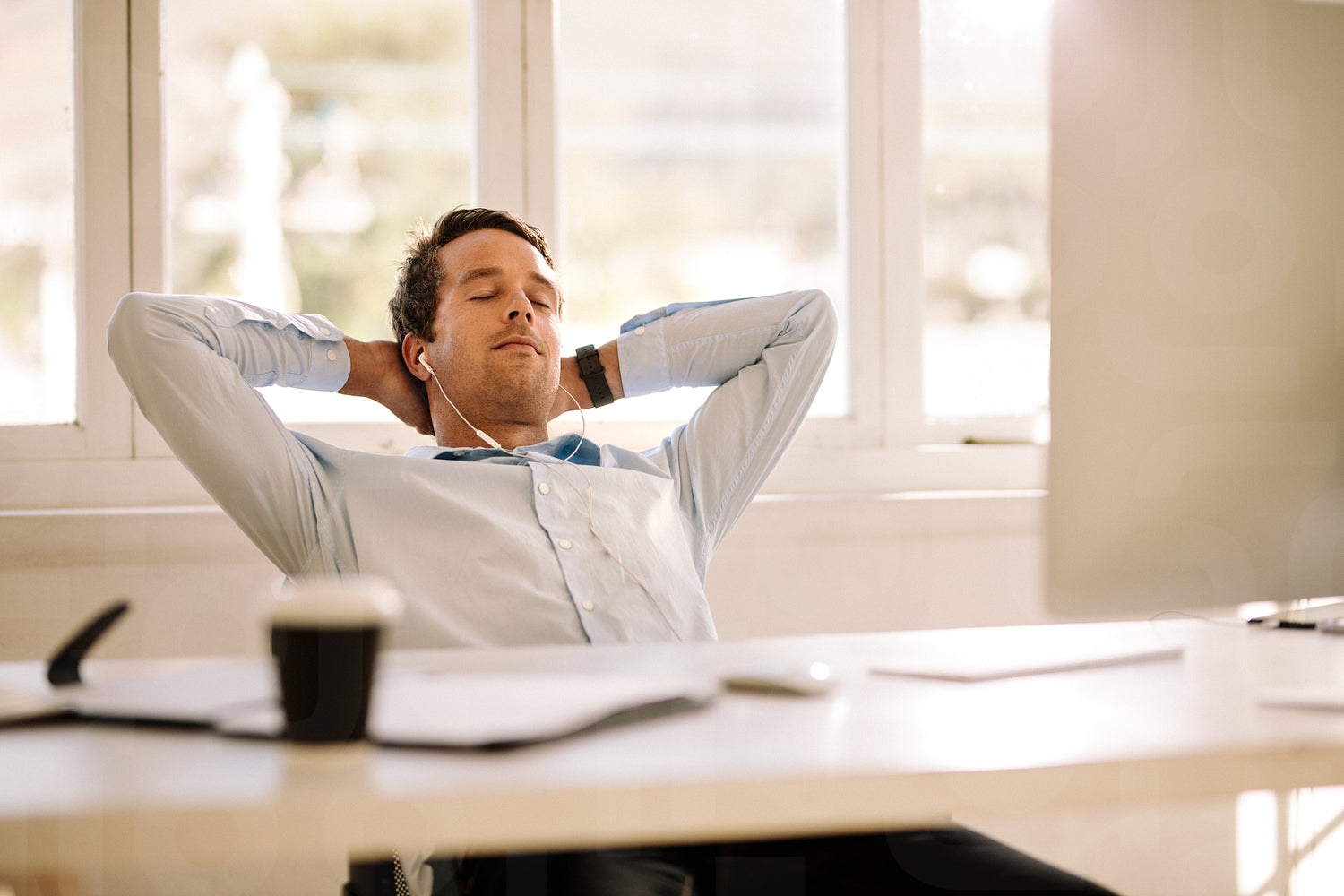 Businessman relaxing at home sitting in front of his work table. Man taking a break and listening to music using earphones with eyes closed.