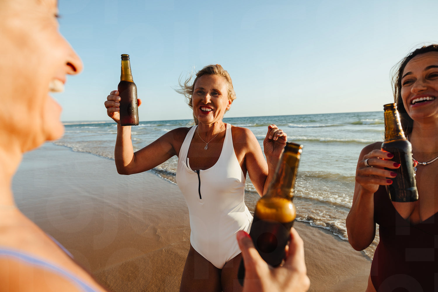 Women enjoying drinks on a beach vacation, holding beers while standing in the shallows by the sea, sharing laughter and happiness under the warm sunlight, symbolizing friendship and relaxation.