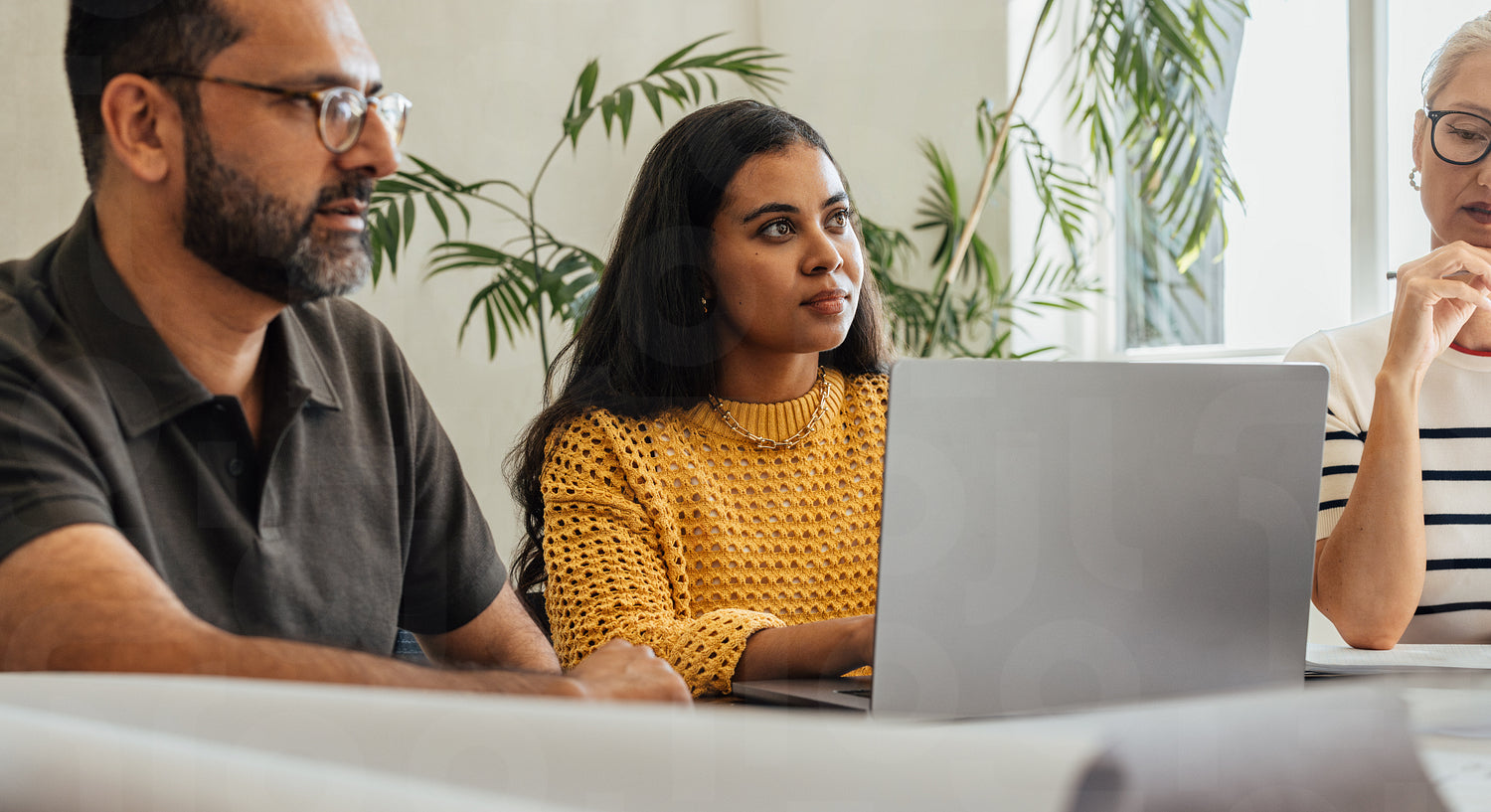 Architectural team brainstorming during a meeting at a modern firm office setting