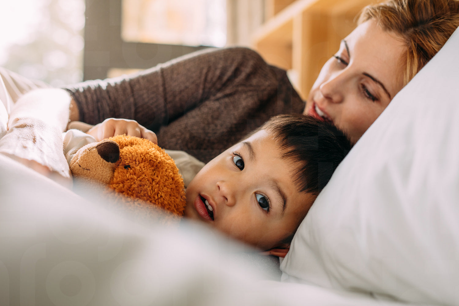 Cute little boy holding his teddy bear and lying on bed with his mother. Small kid in bed with his toy and mother.