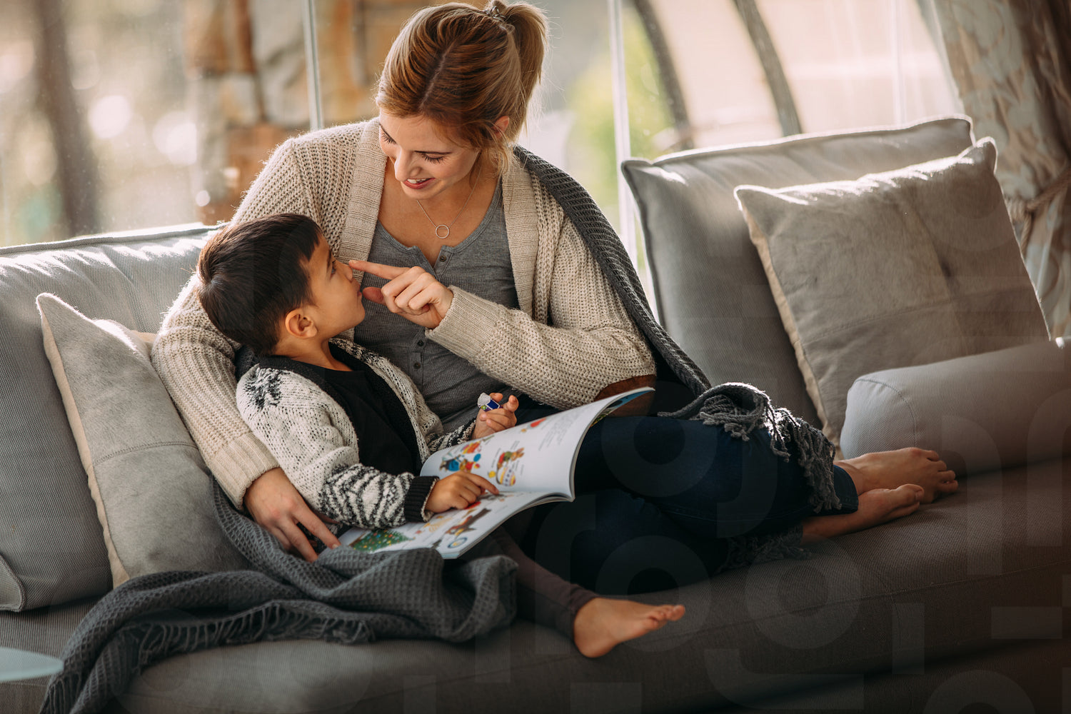 Woman playing with her son sitting on sofa with book. Mother and son having fun while reading a storybook at home. Woman touching nose of her son with book.