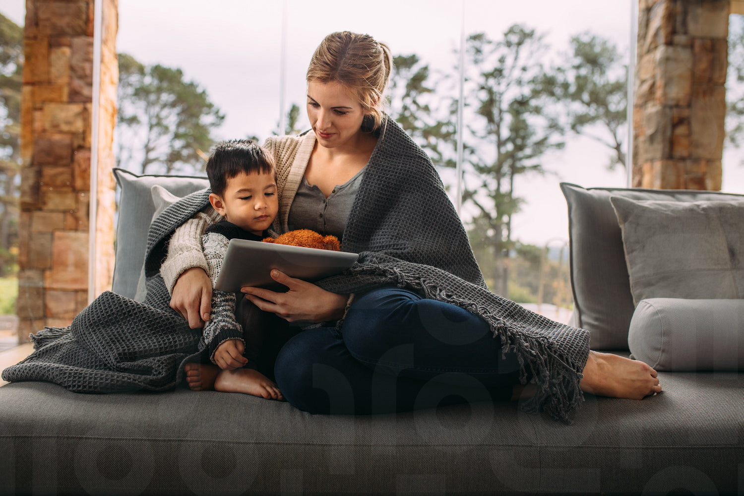 Mother and son sitting on sofa wrapped in blanket looking at digital tablet. Little boy with mother watching cartoons on tablet computer in living room.
