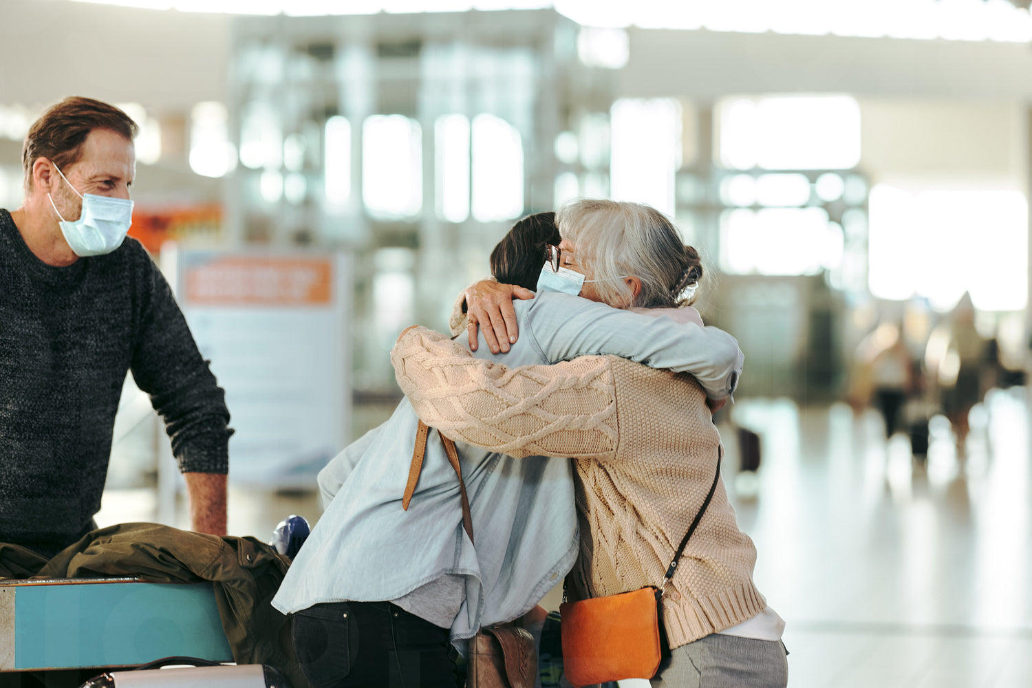 Senior woman welcoming her daughter arriving at airport after pandemic. Woman greeting her mother at airport arrival while her husband looks.