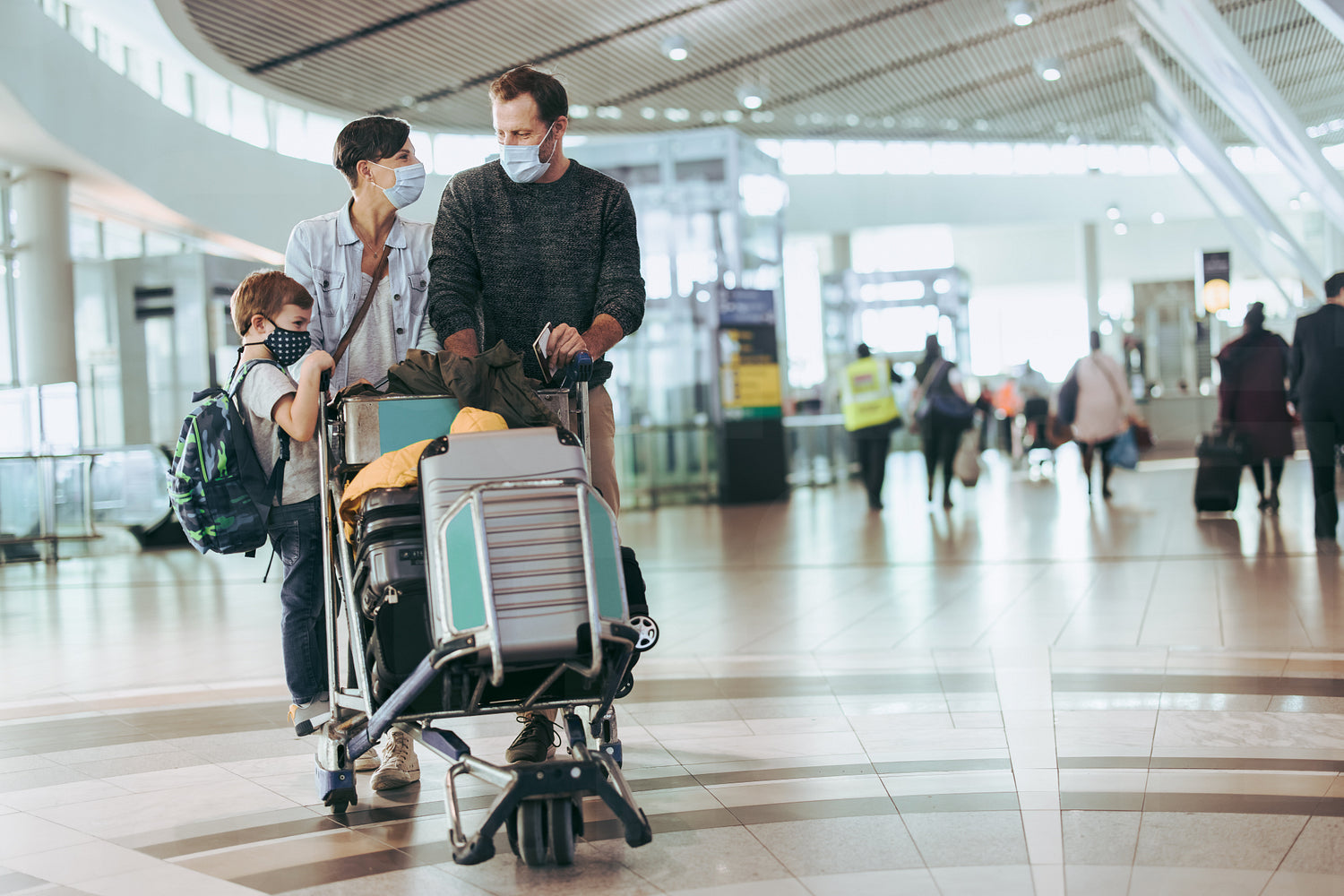 Family of three walking together in airport with luggage trolley in pandemic. Couple talking walking with kid at airport during pandemic.