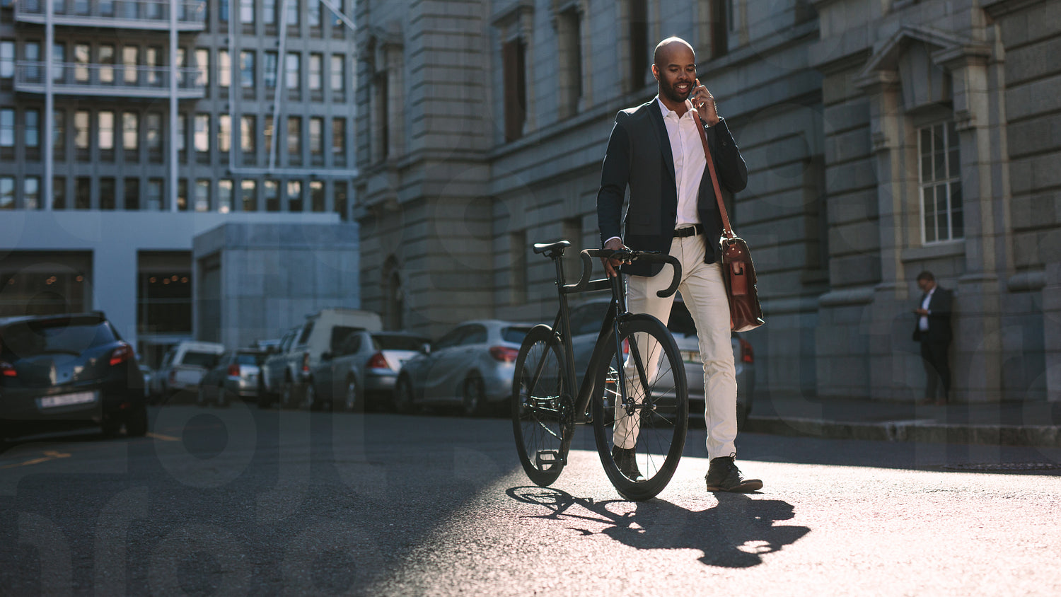 Young businessman walking outdoors with a bicycle and using mobile phone. African man going to work on bike talking over cell phone on city street.