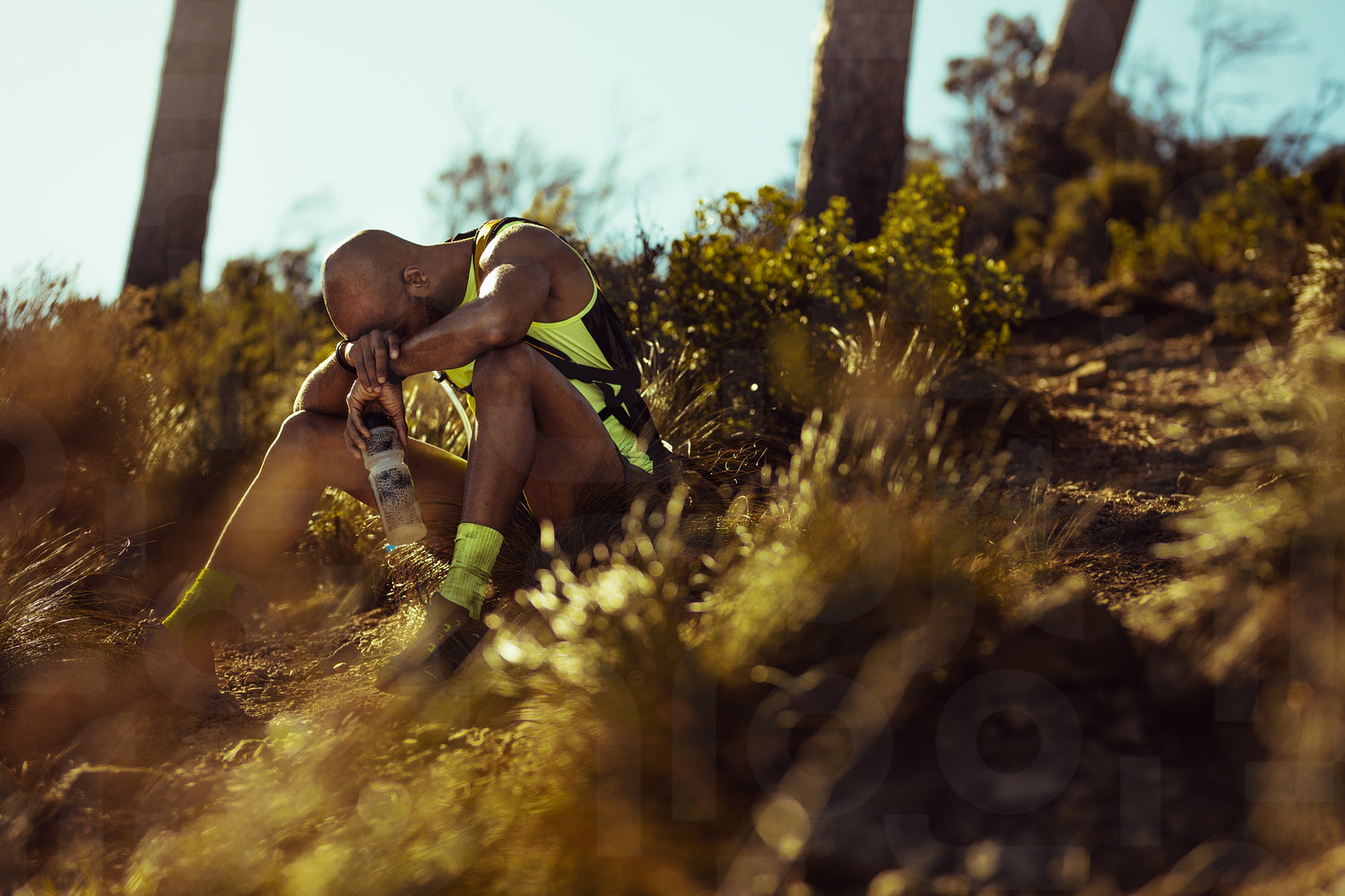 Runner looking tired taking rest on mountain trail
