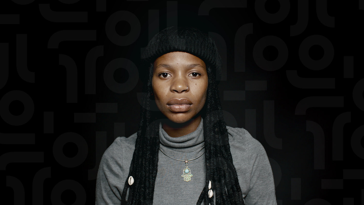 African female in long dreadlocks. Young woman wearing woolly cap looking at camera on black background.