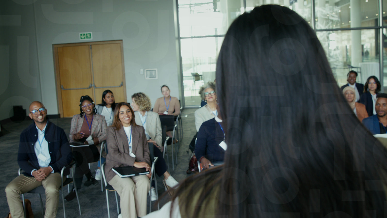 A diverse group of business professionals are captivated by a presentation at a corporate event. They are engaged, listening intently, and some are smiling.