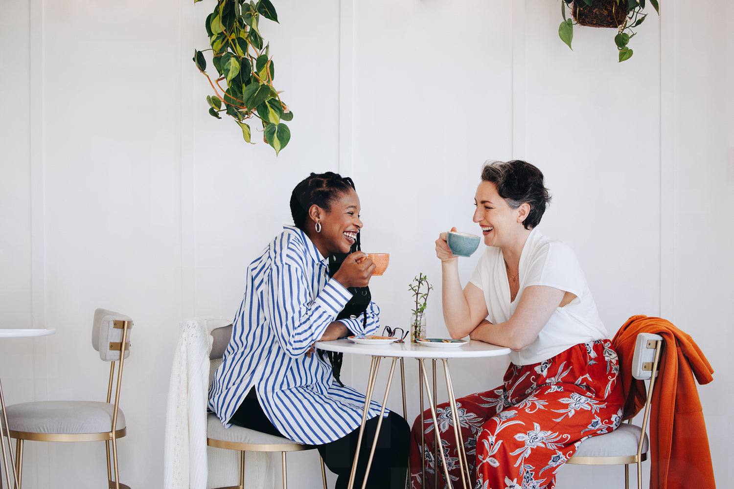 Cheerful businesswomen laughing and having coffee together in an office cafe. Two happy businesswomen enjoying a coffee break together in a modern workplace.