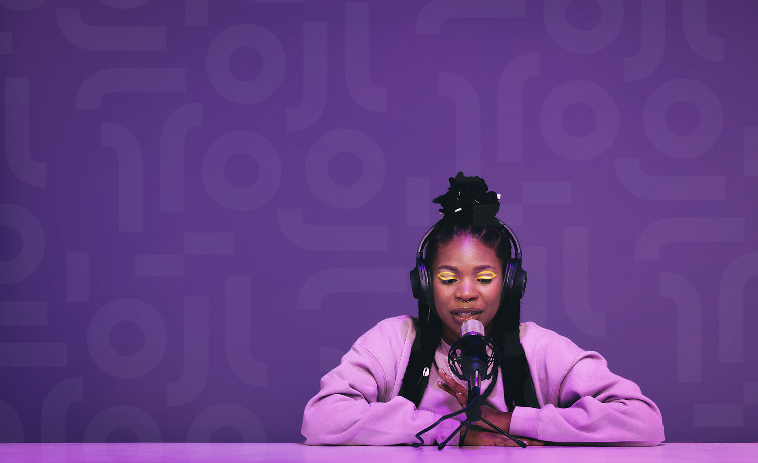 Female podcaster whispering into a microphone while hosting an asmr show. Woman recording a relaxing audio broadcast against a purple background. Black woman creating content for her internet podcast.