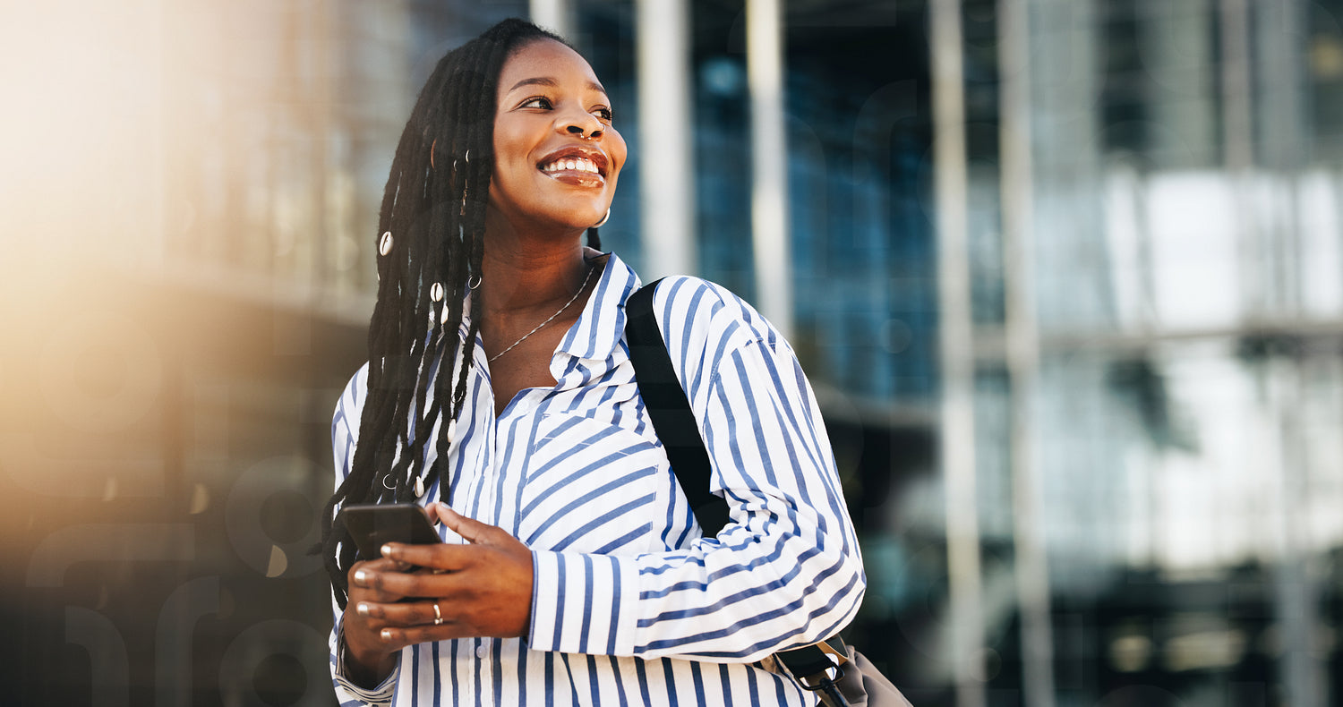 Pensive business woman looking away with a smile while commuting to work in the city. Happy young business woman using a smartphone on her way to the office in the morning.