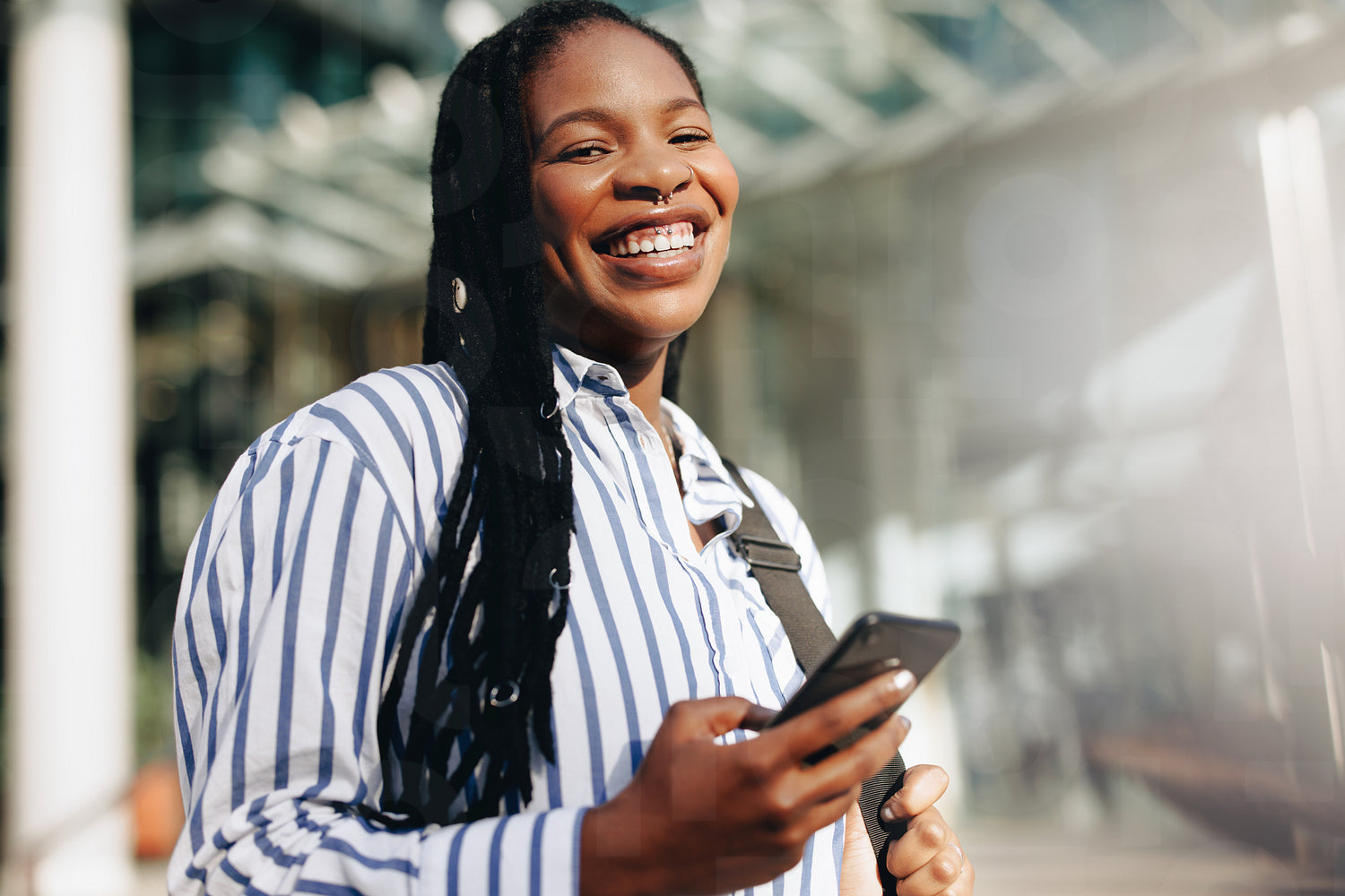 Portrait of a young black businesswoman smiling at the camera on her way to work in the city. Happy young business woman using a smartphone while commuting in the morning.