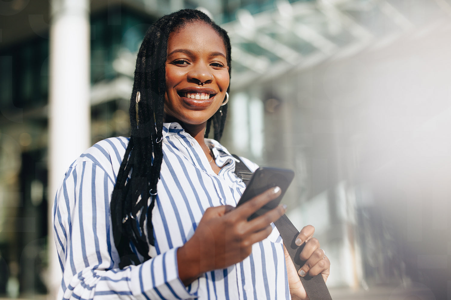 Young business woman smiling at the camera while commuting to her office in the city. Portrait of a happy young business woman using a smartphone on her way to work in the morning.