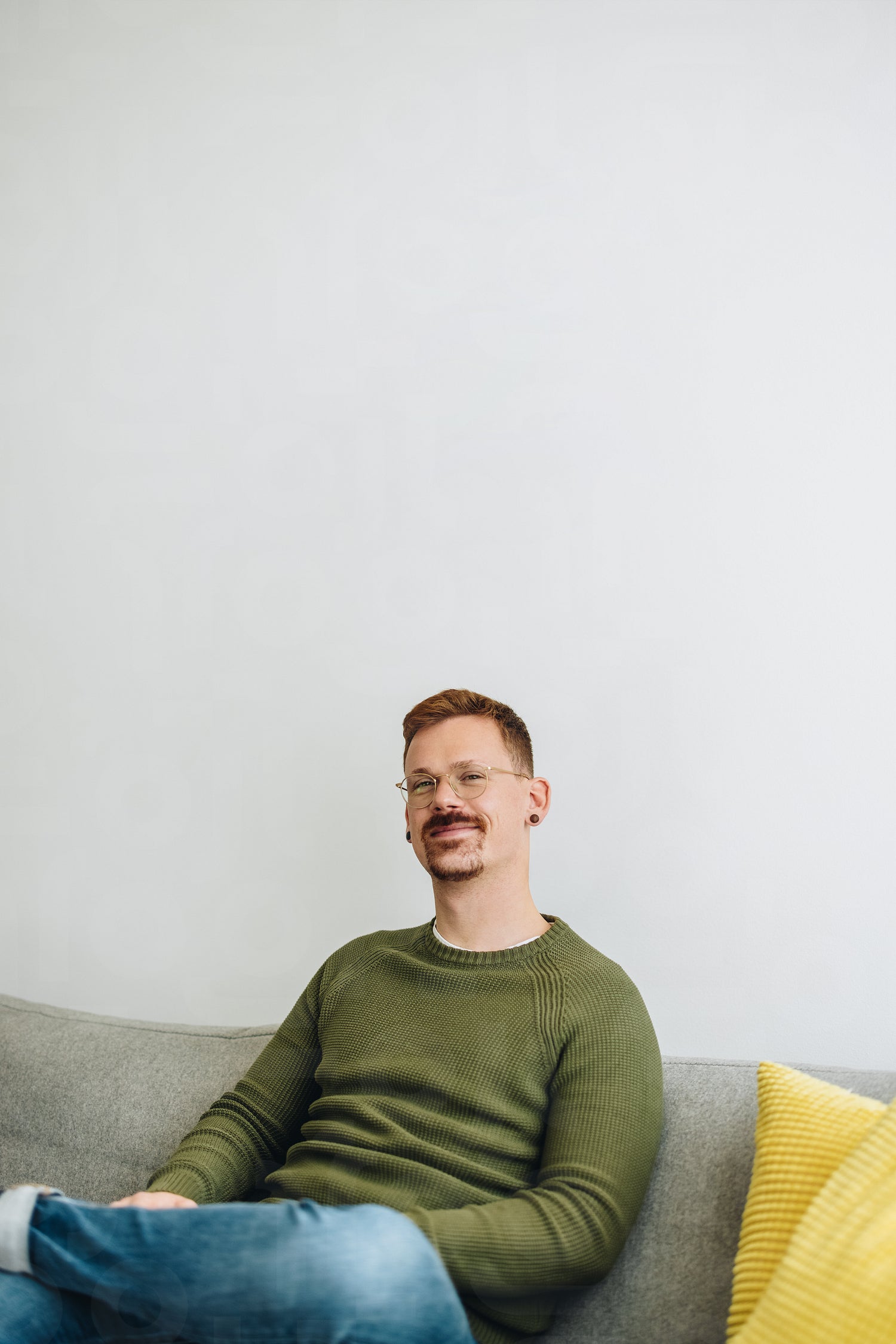 Man sitting in lobby looking at camera. Confident male entrepreneur relaxing on sofa.