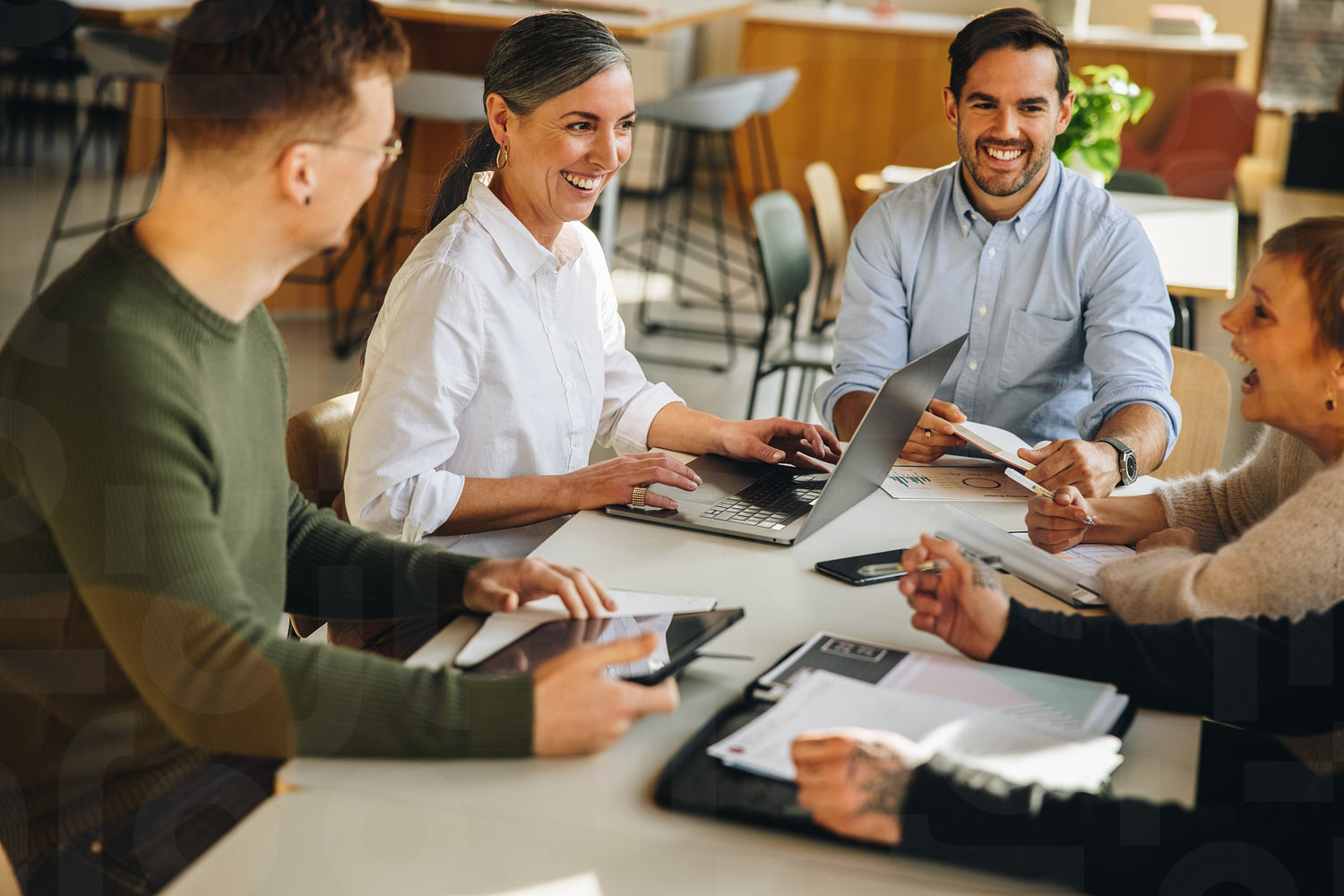 Creative team sitting around table discussing new project. Business people meeting in office boardroom.